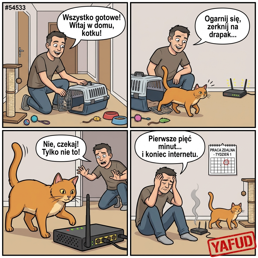 Zdecydowałem się na adopcję kota ze schroniska. Wyprawkę przygotowałem wzorowo: drapak, zabawki i najlepsza karma. Kiedy przywiozłem transporter z kotem do domu, otworzyłem drzwiczki w przedpokoju. Kot powoli wyszedł, rozejrzał się po nowym otoczeniu, po czym podszedł prosto do mojego routera internetowego stojącego na podłodze. Zwierzę podniosło ogon i oddało mocz dokładnie w otwory wentylacyjne działającego urządzenia. Router zaiskrzył i wyłączył się na zawsze w ciągu pierwszych pięciu minut kociego pobytu w domu. Straciłem połączenie z siecią w dniu, w którym zaczynałem tydzień pracy zdalnej. YAFUD«Poprzednia wpadkaNastępna wpadka »