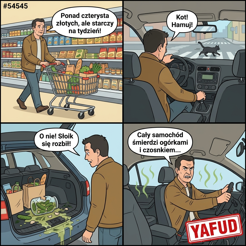 Pojechałem na duże zakupy spożywcze na cały tydzień. Spędziłem w supermarkecie ponad godzinę, ładując wózek po same brzegi. Zapłaciłem przy kasie ponad czterysta złotych i spakowałem wszystko do dużych toreb. Włożyłem zakupy do bagażnika samochodu i ruszyłem do domu. Na ostatnim skrzyżowaniu przed moim blokiem musiałem gwałtownie zahamować przed kotem. Usłyszałem głuchy trzask z tyłu auta. Pod domem otworzyłem bagażnik i zamarłem. Duży słoik z kiszonymi ogórkami pękł, uderzając o twardą krawędź boczka. Woda z czosnkiem i koprem zalała mi całą tapicerkę w bagażniku. Samochód śmierdzi teraz tak bardzo, że nie da się nim jeździć z zamkniętymi oknami. YAFUD«Poprzednia wpadkaNastępna wpadka »