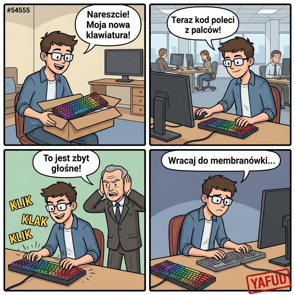 Dzisiaj rano odebrałem nową klawiaturę mechaniczną do pracy. Kosztowała sporo pieniędzy i miała pomóc mi w szybszym pisaniu kodu. Zaniosłem ją do biura typu open space. Podłączyłem sprzęt do komputera i zacząłem pracować. Po dziesięciu minutach pisania podszedł do mnie przełożony. Stwierdził, że przełączniki są zbyt głośne i rozpraszają innych. Kazał mi odłączyć nową klawiaturę i wrócić do starej membranówki. YAFUD«Poprzednia wpadkaNastępna wpadka »