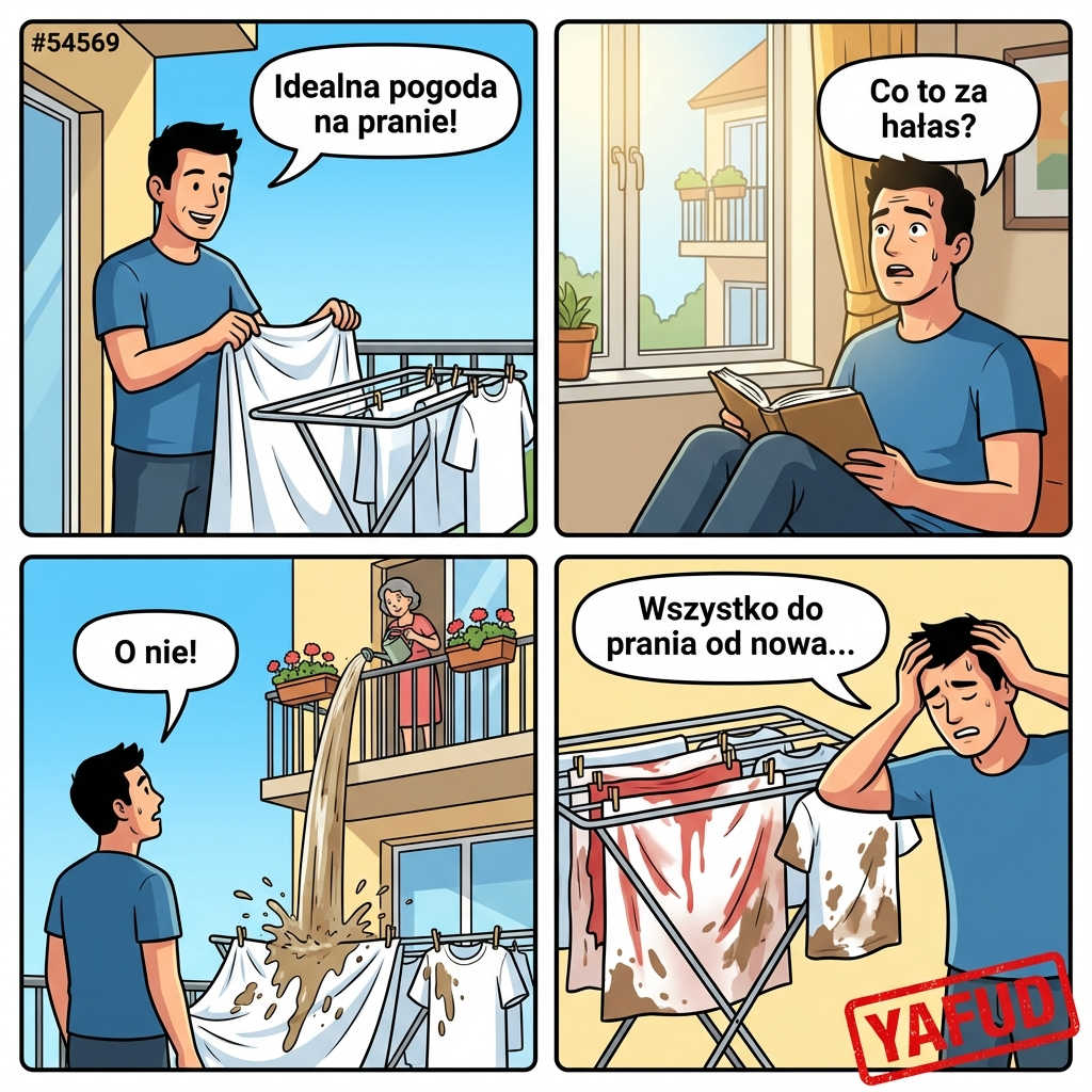 Wykorzystałem słoneczną pogodę na zrobienie dużego prania. Wyprałem pościel, jasne ręczniki oraz kilka białych koszul. Rozwiesiłem wszystko dokładnie na suszarce balkonowej. Pranie miało schnąć przez całe popołudnie na świeżym powietrzu. Po dwóch godzinach usłyszałem dźwięk lejącej się wody. Wyszedłem na balkon, aby sprawdzić sytuację. Okazało się, że sąsiadka z piętra wyżej postanowiła obficie podlać swoje pelargonie. Z jej doniczek zaczęła wylewać się brudna, błotnista woda. Cała ta ciecz spłynęła bezpośrednio na moją schnącą, białą pościel i koszule. Materiał pokrył się rdzawymi zaciekami i plamami z ziemi. Całe pranie nadaje się do ponownego, długiego czyszczenia w wysokiej temperaturze. YAFUD.«Poprzednia wpadkaNastępna wpadka »