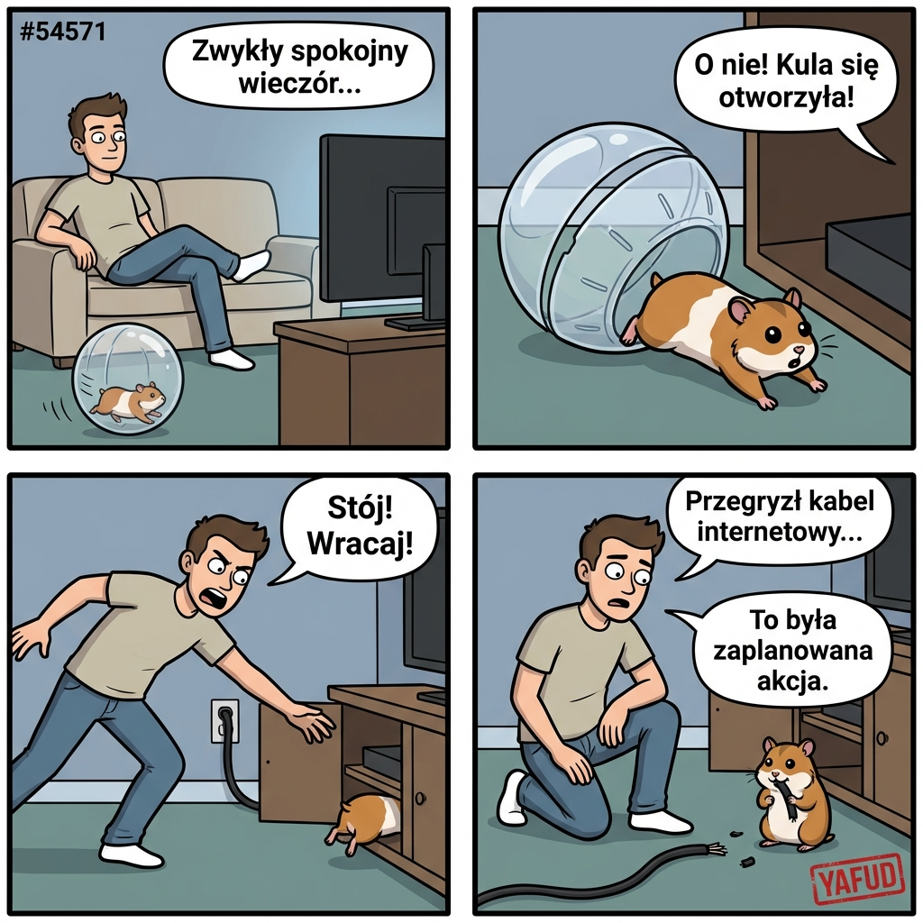 Siedziałem na kanapie, oglądając telewizję. Mój chomik biegał po podłodze w swojej plastikowej, przezroczystej kuli spacerowej. Nagle kula otworzyła się na łączeniu, a chomik wybiegł pod szafkę RTV. Zanim zdążyłem go złapać, przegryzł główny kabel optyczny od internetu. Wyglądało to jak starannie zaplanowana akcja. YAFUD«Poprzednia wpadka