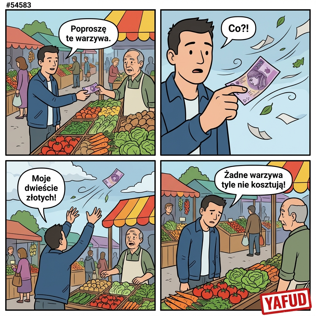 Kupowałem warzywa na miejscowym targowisku. Podałem sprzedawcy banknot dwustuzłotowy, a silny podmuch wiatru wyrwał mi go z palców i porwał w siną dal. Nawet super bio-ekologiczne, fifarafa, nie wiadomo jakie warzywa tyle nie kosztują! YAFUD«Poprzednia wpadkaNastępna wpadka »