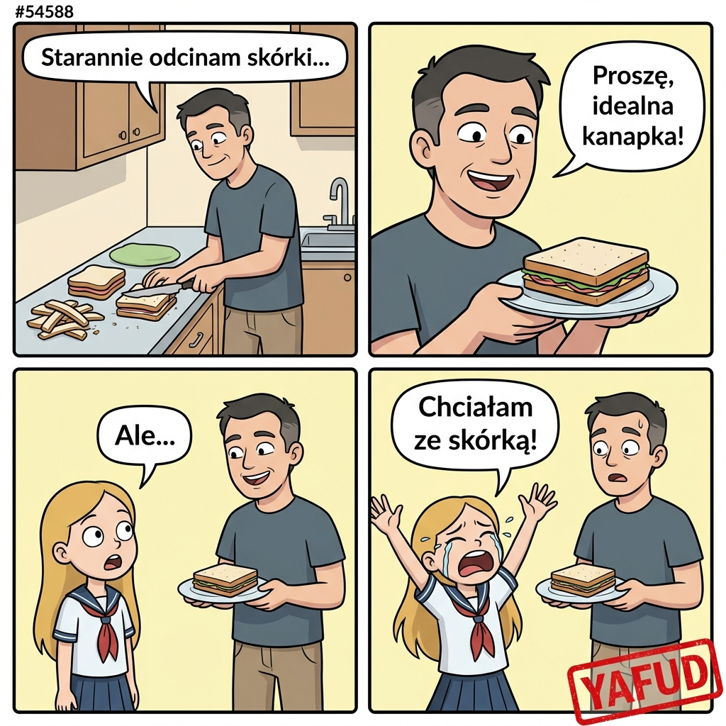 Zrobiłem córce kanapkę do szkoły. Starannie odkroiłem wszystkie skórki od chleba. Córka spojrzała na śniadanie i zaczęła głośno płakać. Stwierdziła, że akurat dzisiaj miała wielką ochotę zjeść kanapkę ze skórką. YAFUD.«Poprzednia wpadkaNastępna wpadka »