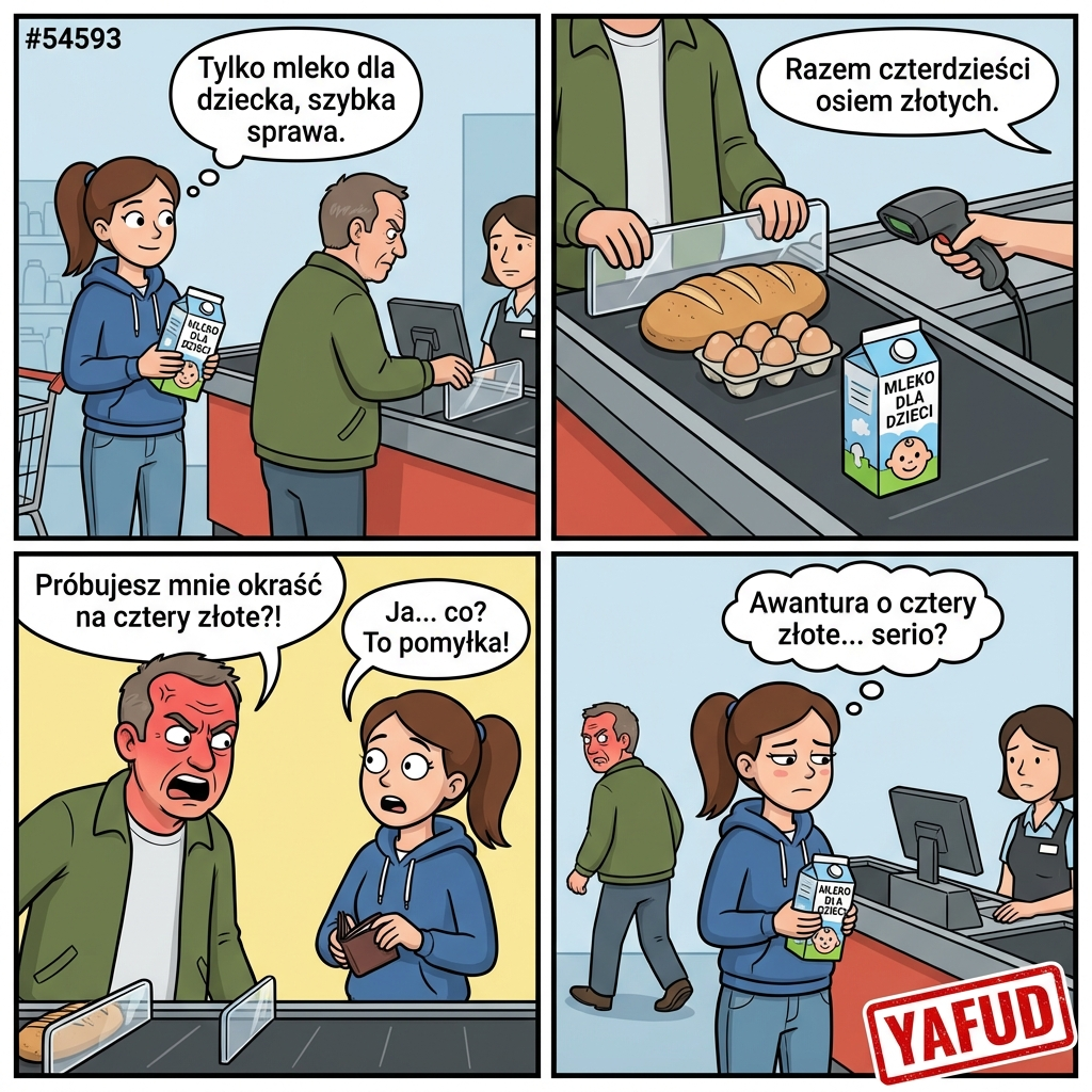 Stałam w kolejce do kasy z jednym produktem w ręce - mlekiem dla dziecka. Osoba przede mną wyłożyła na taśmę towar i położyła separator, po czym ja położyłam mleko. Kasjerka omyłkowo doliczyła moje mleko do rachunku tej osoby. Koleś zrobił mi potężną awanturę, że próbuję go okraść na cztery złote. YAFUD«Poprzednia wpadkaNastępna wpadka »