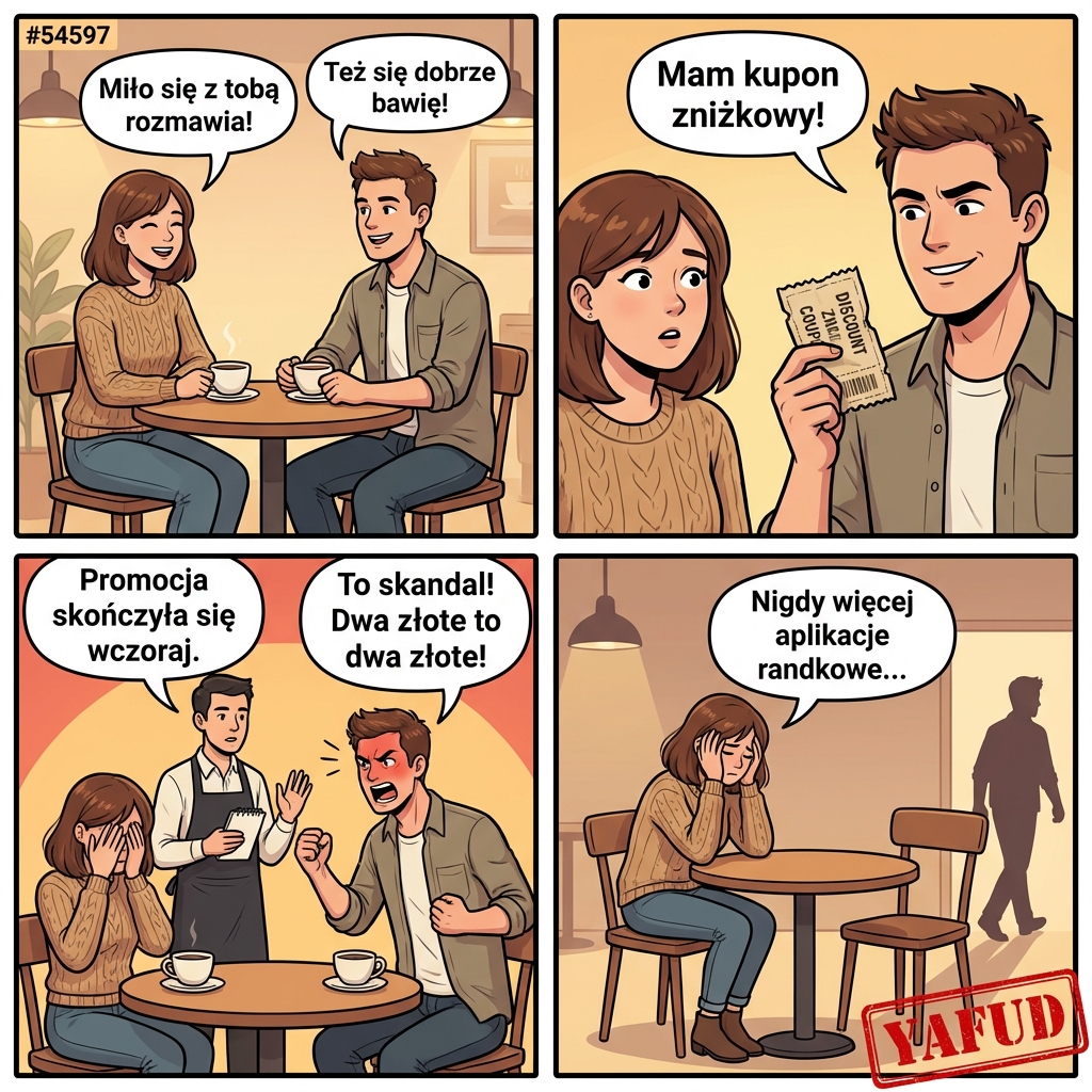 Poszłam na pierwszą randkę z facetem poznanym w aplikacji randkowej. Spotkaliśmy się w małej kawiarni w centrum miasta. Rozmowa układała się całkiem dobrze do momentu uregulowania rachunku. Mój towarzysz wyciągnął z portfela pognieciony kupon zniżkowy. Kelner odmówił jego przyjęcia, twierdząc, że promocja skończyła się wczoraj. Mój niedoszły partner zrobił awanturę i pokłócił się z obsługą o dwa złote rabatu. YAFUD«Poprzednia wpadkaNastępna wpadka »