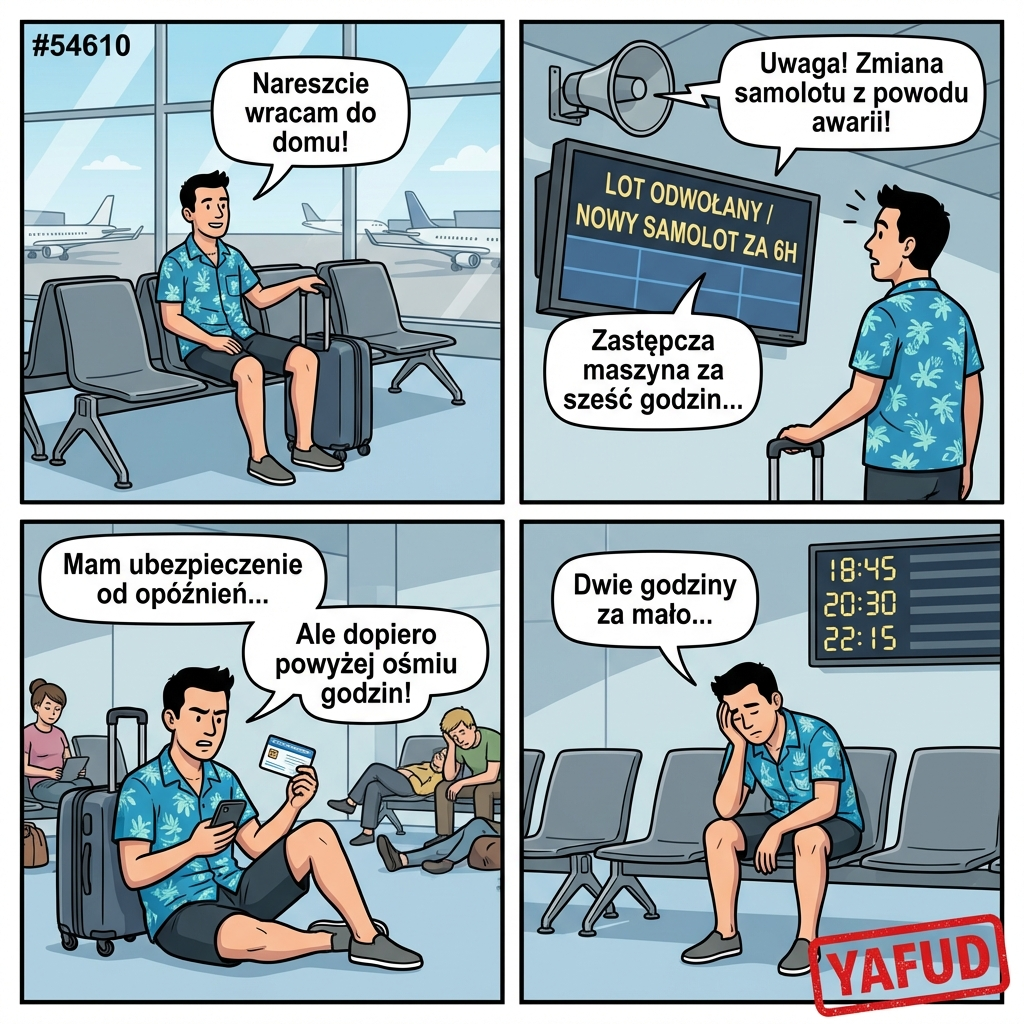 Wracałem samolotem z wakacji. Przeszliśmy kontrolę bezpieczeństwa i czekaliśmy pod bramką. Dwie minuty przed planowanym boardingiem ogłoszono zmianę samolotu z powodu awarii nawigacji. Zastępcza maszyna przyleciała dopiero za sześć godzin z innego węzła komunikacyjnego. Moje ubezpieczenie obejmuje opóźnienia dopiero powyżej ośmiu godzin. YAFUD«Poprzednia wpadkaNastępna wpadka »