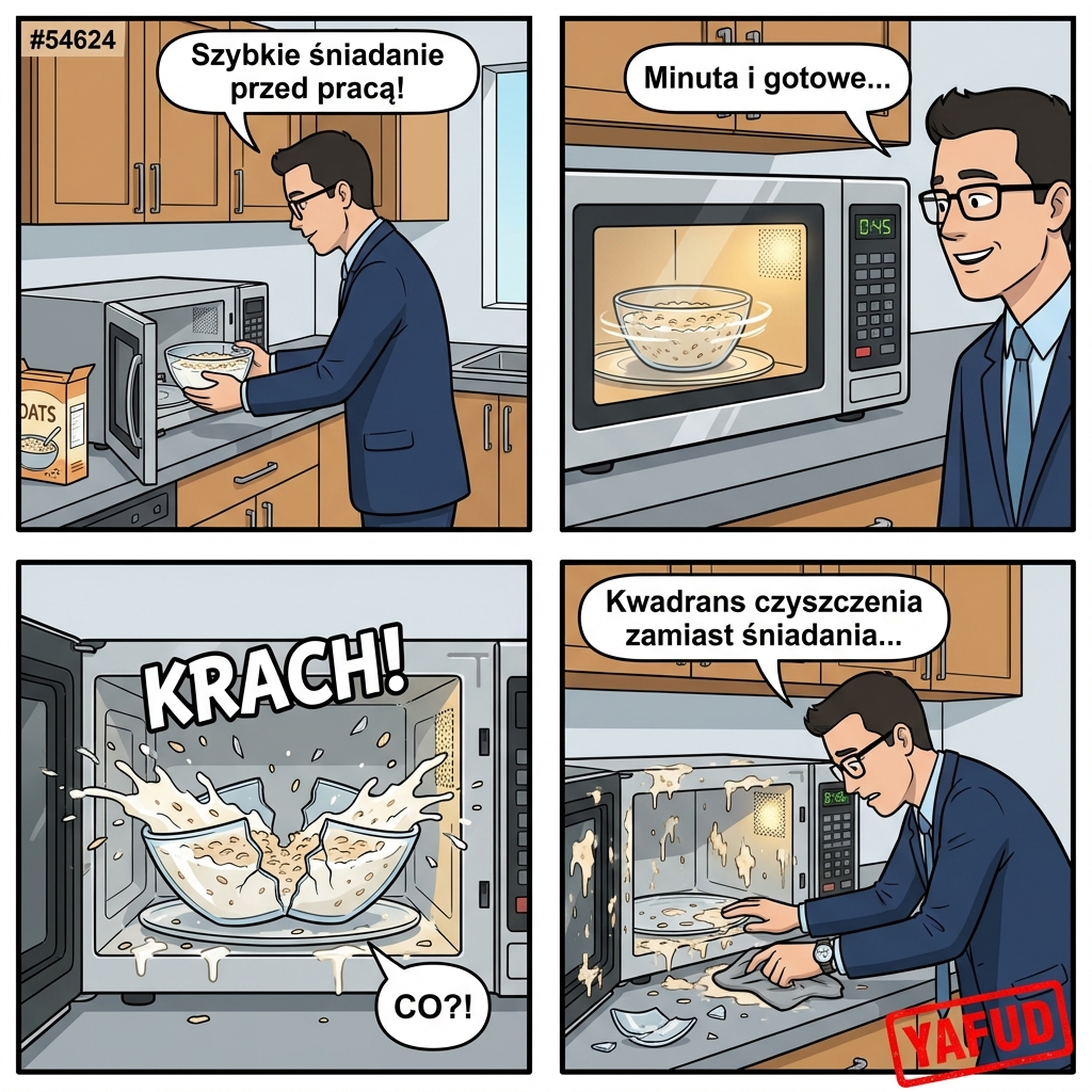 Przygotowywałem sobie owsiankę na szybkie śniadanie przed wyjściem do biura. Użyłem szklanej miski, z której zawsze korzystam przy podgrzewaniu mleka w mikrofali. Po minucie grzania naczynie niespodziewanie pękło na dwie równe połowy. Rozgrzane mleko z płatkami zalało cały talerz obrotowy i dno mikrofalówki. Zamiast zjeść ciepły posiłek, musiałem spędzić kwadrans na wycieraniu lepkiej mazi. YAFUD«Poprzednia wpadkaNastępna wpadka »