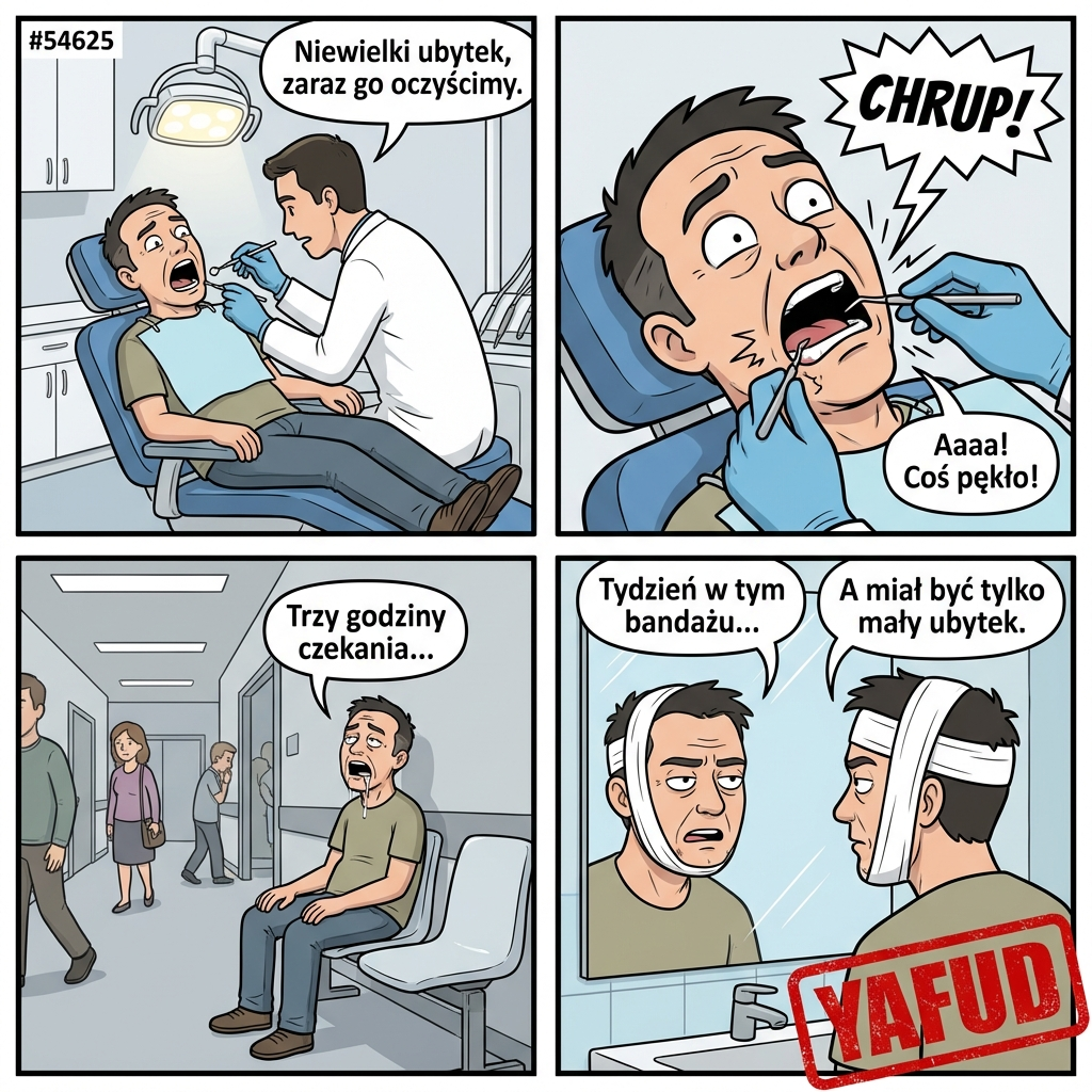 Od kilku dni dokuczał mi niewielki ból zęba przy piciu zimnych napojów. Umówiłem się na poranną wizytę u mojego zaufanego stomatologa. Zostałem przyjęty punktualnie, a lekarz szybko zlokalizował niewielki ubytek. Po podaniu znieczulenia miejscowego rozpoczął standardowe oczyszczanie zęba. Leżałem na fotelu z szeroko otwartymi ustami, starając się nie ruszać. W pewnym momencie nastąpił nietypowy, mimowolny skurcz moich mięśni żuchwy. Rozległo się wyraźne, głośne chrupnięcie w okolicy prawego ucha. Okazało się, że z powodu specyficznego ułożenia szczęki doszło do zwichnięcia stawu skroniowo-żuchwowego. Dentysta musiał natychmiast przerwać pracę i wezwać pogotowie. Trafiłem prosto na ostry dyżur chirurgii szczękowej z zablokowanymi i otwartymi ustami. Spędziłem na korytarzu szpitalnym trzy godziny, obficie się śliniąc z powodu niemożności przełykania. Szczękę nastawiono mi w kilka sekund, ale muszę przez tydzień nosić specjalną opaskę. YAFUD«Poprzednia wpadkaNastępna wpadka »