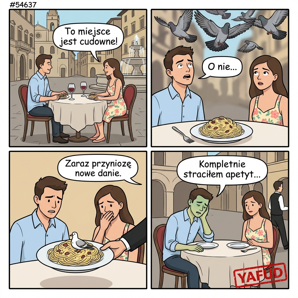 Umówiłem się na randkę w eleganckiej restauracji na rynku. Usiedliśmy przy stoliku na zewnątrz i zamówiliśmy jedzenie. Nad nami przelatywało stado gołębi. Jeden z ptaków załatwił się prosto do mojego talerza z makaronem. Kelner zauważył to i zabrał danie, ale apetyt całkowicie mi odszedł. YAFUD«Poprzednia wpadkaNastępna wpadka »