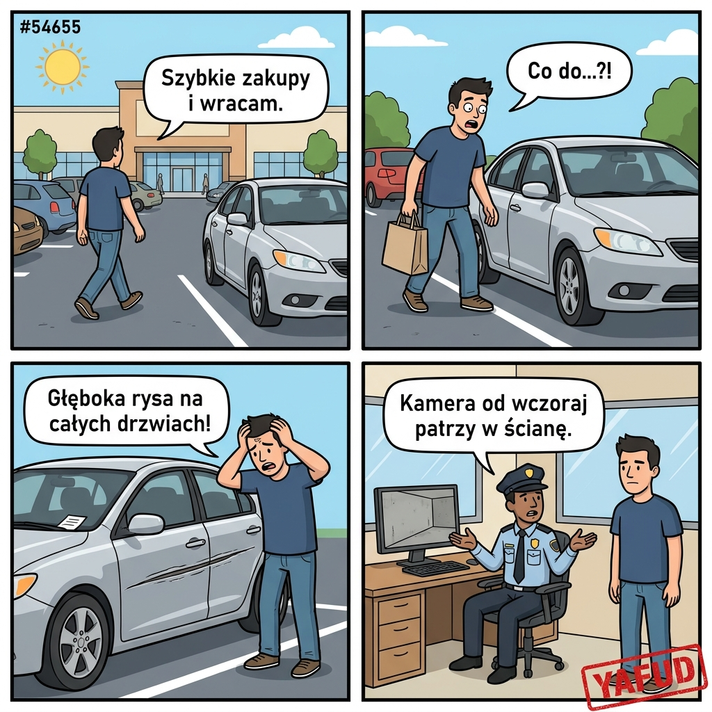 Zaparkowałem samochód pod centrum handlowym i poszedłem zrobić szybkie zakupy. Kiedy wróciłem po godzinie, zobaczyłem głęboką rysę na całych prawych drzwiach od strony pasażera. Sprawcy oczywiście nie było, a za wycieraczką nie znalazłem żadnej kartki z numerem telefonu. Poszedłem do ochrony centrum z prośbą o udostępnienie nagrań z monitoringu. Okazało się, że jedyna kamera na tym sektorze była odwrócona w stronę ściany po wczorajszej konserwacji. YAFUD«Poprzednia wpadkaNastępna wpadka »