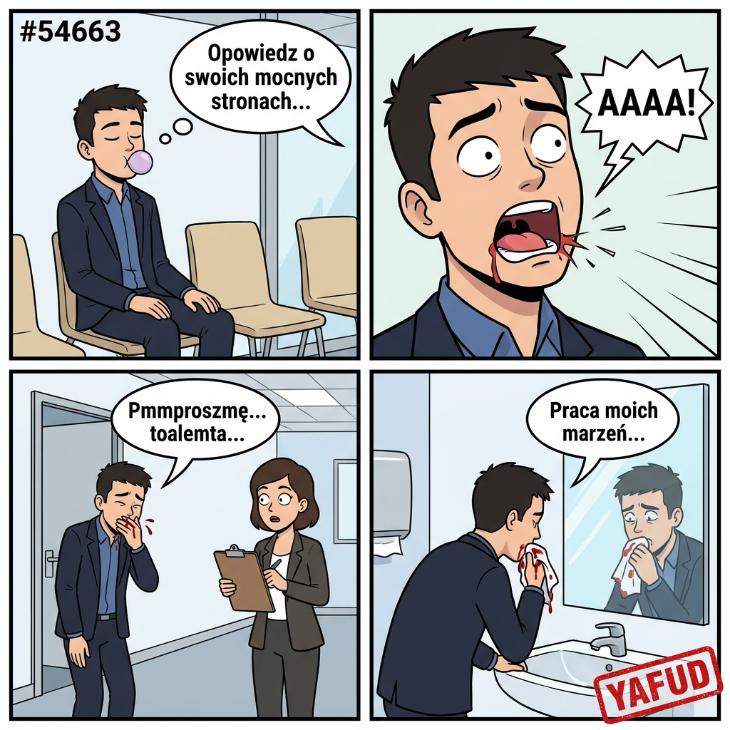 Przygotowywałem się do rozmowy kwalifikacyjnej o pracę moich marzeń. Siedziałem już w poczekalni biura, powtarzając w myślach odpowiedzi na typowe pytania. Żułem gumę, żeby odświeżyć oddech przed wejściem do gabinetu. Nagle podczas przeżuwania mocno i głęboko ugryzłem się w język. Ból był paraliżujący, a z rany zaczęła intensywnie lecieć krew. Musiałem przeprosić rekrutera przez zaciśnięte zęby i wyjść do toalety z krwawiącymi ustami. YAFUD«Poprzednia wpadkaNastępna wpadka »