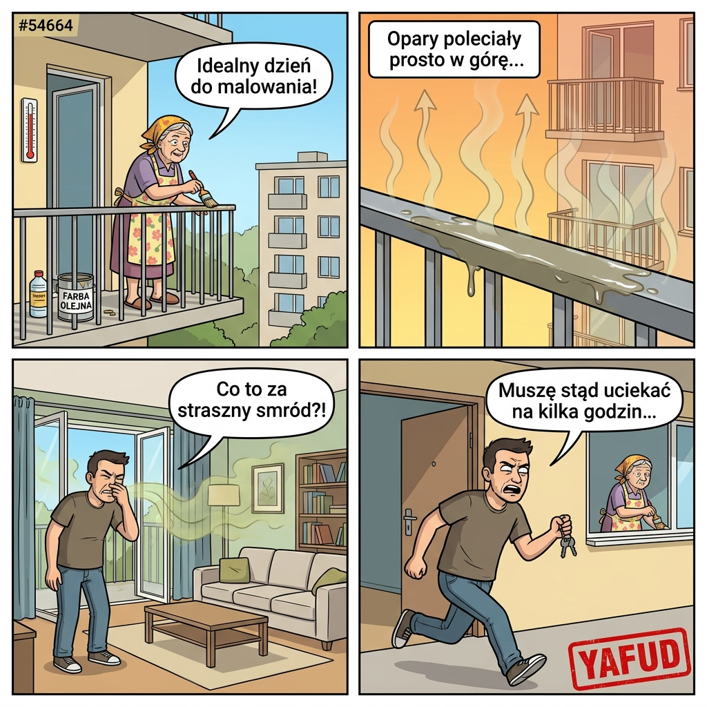 Moja sąsiadka z parteru postanowiła pomalować balustradę swojego balkonu tanią farbą olejną. Zrobiła to w najbardziej upalny dzień lata. Opary rozpuszczalnika unosiły się pionowo do góry, trafiając idealnie do mojego mieszkania na pierwszym piętrze. Smród był tak intensywny, że nie mogłem przebywać we własnym salonie i musiałem wyjść z domu na kilka godzin. YAFUD«Poprzednia wpadkaNastępna wpadka »