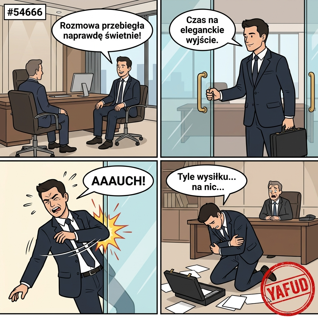 Rozmowa kwalifikacyjna na stanowisko menedżerskie szła mi świetnie i byłem pewny swoich argumentów. Kiedy wychodziłem z biura prezesa, chciałem elegancko chwycić za mosiężną klamkę. Moja ręka lekko się omsknęła, a ja straciłem równowagę. Z całej siły uderzyłem łokciem w krawędź otwartych, szklanych drzwi gabinetu. Ból nerwu uderzył mnie prądem na tyle mocno, że jęknąłem głośno z bólu i wypuściłem teczkę z dokumentami na podłogę. YAFUD«Poprzednia wpadkaNastępna wpadka »