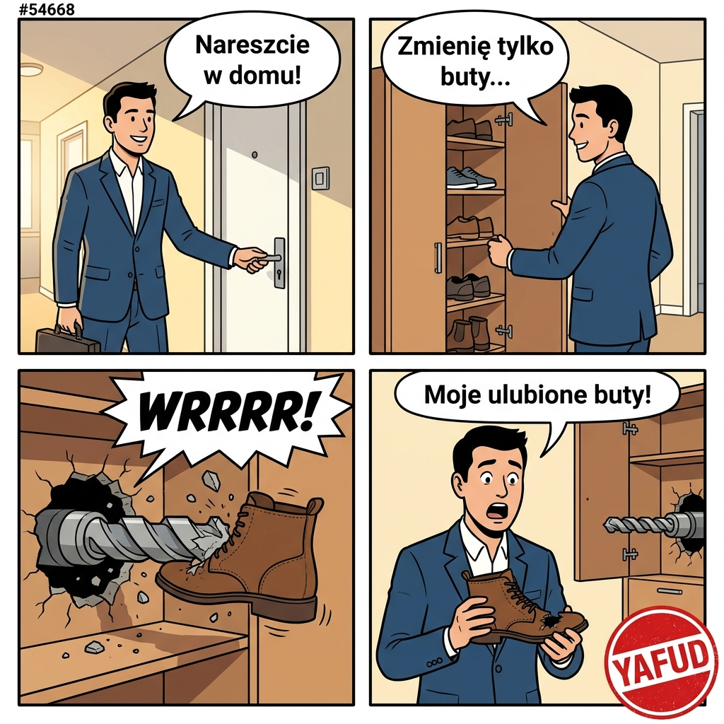 Wracałem z pracy w dobrym humorze i otworzyłem szafkę na buty w przedpokoju. Moja sąsiadka, z którą dziele wspólną ścianę korytarza, przewiercała się wiertarką udarową na wylot do mojego mieszkania. Grube wiertło do betonu przeszło przez ścianę, wchodząc prosto do wnętrza mojej szafki wnękowej. Wiertło zniszczyło na wylot cholewkę mojego ulubionego, zamszowego buta leżącego na górnej półce i zrujnowało obicie mebla. YAFUD«Poprzednia wpadkaNastępna wpadka »