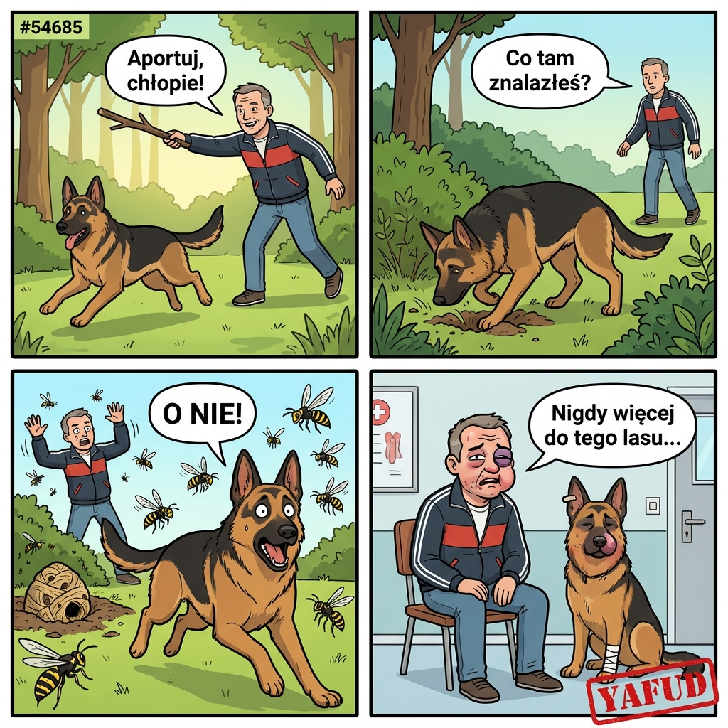 Zabrałem swojego owczarka niemieckiego na długi spacer do lasu tuż za miastem. Pies biegał swobodnie po dużej polanie, aportując rzucane przeze mnie patyki. Pogoda dopisywała, więc planowałem spędzić tam aktywnie przynajmniej dwie godziny na świeżym powietrzu. Zauważyłem, że pies zatrzymał się i zaczął intensywnie węszyć w gęstych krzakach. Zanim zdążyłem go zawołać z powrotem, wybiegł z zarośli z czymś szarym w pysku. Okazało się, że znalazł gniazdo dzikich os na ziemi i postanowił je z ciekawości wygrzebać łapami. Zdezorientowane i wściekłe owady ruszyły w pościg prosto za moim psem, który ze strachu pobiegł w moją stronę. Zostaliśmy obaj dotkliwie pożądleni na całym ciele w przeciągu zaledwie kilkunastu sekund. Spacer zakończył się szybką wizytą na ostrym dyżurze weterynaryjnym i na pogotowiu ratunkowym dla mnie. Moja twarz z powodu opuchlizny wygląda teraz jak po ciężkiej walce bokserskiej. YAFUD«Poprzednia wpadkaNastępna wpadka »