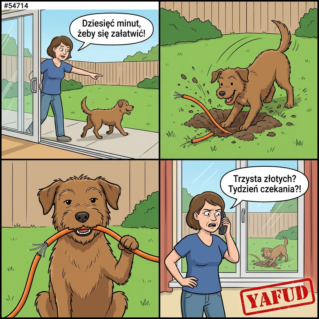 Mój pies ma w zwyczaju kopać dołki w ogródku. Dzisiaj wypuściłam go na zewnątrz na zaledwie dziesięć minut, żeby załatwił swoje potrzeby. W tym krótkim czasie zdążył wygrzebać kabel od internetu światłowodowego, który był zakopany tuż pod trawnikiem, i przegryźć go na pół. Monter z firmy telekomunikacyjnej powiedział, że wymiana będzie kosztować mnie trzysta złotych, a termin mają dopiero za tydzień. YAFUD«Poprzednia wpadkaNastępna wpadka »