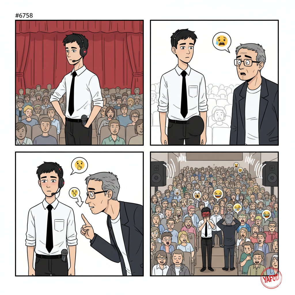 Prowadziłem konferansjerkę szkolnej uroczystości w moim liceum. Prawie 1000 uczniów i drugie tyle rodziców w jednym miejscu. Na głowie miałem założony bezprzewodowy mikrofon. W ręku miałem drugi, ręczny mikrofon, który miałem potem wręczyć przemawiającemu dyrektorowi. Tuż przed rozpoczęciem, gdy sprawdzałem czy wszystko działa, włożyłem na chwilę ten mikrofon do kieszeni spodni (zrobiła się wypchana). Po chwili podszedł do mnie zaaferowany wychowawca mojej klasy i wyszeptał mi na ucho: "Przyklep sobie, bo ci sterczy". Niestety wyszeptał to też do włączonego mikrofonu, który miałem na głowie i usłyszeli to wszyscy zgromadzeni. YAFUD«Poprzednia wpadkaNastępna wpadka »