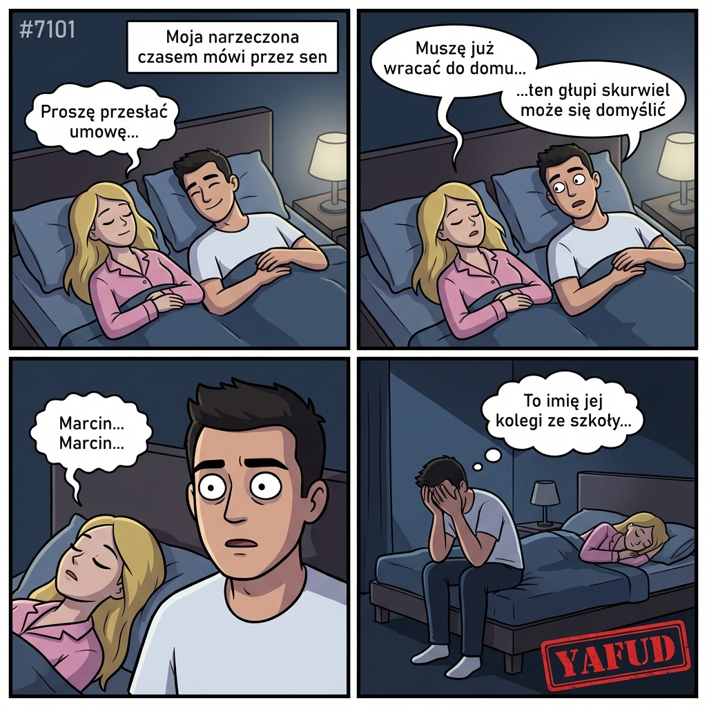 1tak się zdarza dość często. Moja dziewczyna w czasie snu powiedziała raz numer telefonu. Gdy potem na niego zadzwoniłem, okazało się, że to numer jej kochanka. Innym razem dowiedziałem się, że swój pierwszy raz przeżyła mając 14 lat na weselu swojej kuzynki. Ale to jeszcze nic: kiedyś sobie śpię, a ona zaczyna recytować "wielką improwizację", bo pracując w teatrze podsłyszała jednego z aktorów w czasie próby.