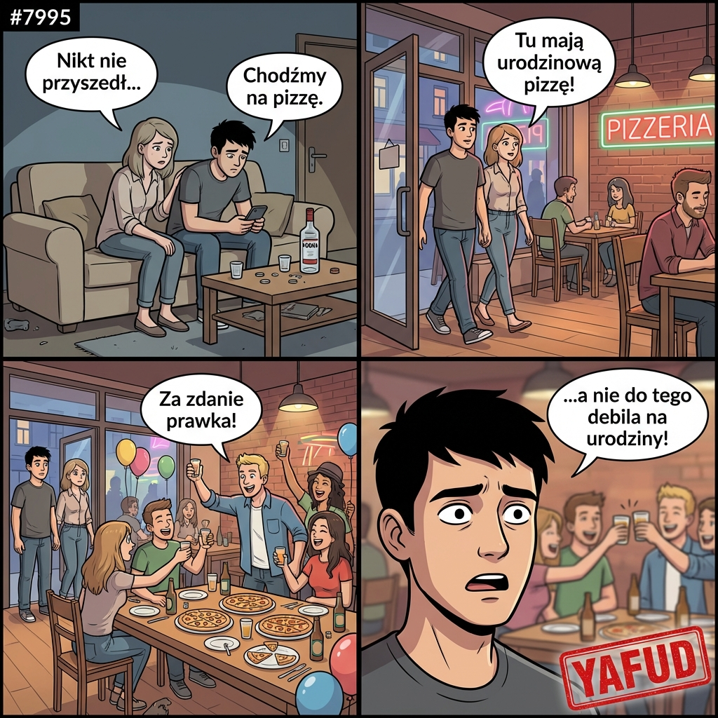 25Przynajmniej masz dziewczyne :) A co do tych niby przyjaciol, oby po tej pizzy dostali niestrawnosci i mieli sraczke giganta przez tydzien.