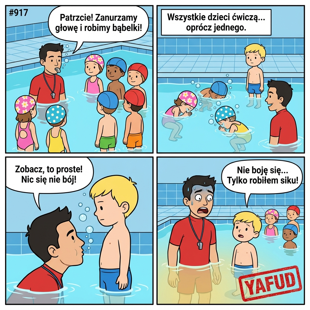 Pracuję jako instruktor pływania. Dzisiaj uczyłem dzieci, żeby nie bały się wody. Zanurzałem twarz i puszczałem bąbelki. Poprosiłem dzieci, żeby zrobiły to samo i wszystkie, z wyjątkiem jednego chłopca, posłusznie wykonały ćwiczenie. Podszedłem więc do niego, zanurzyłem twarz tuż przy nim i dmuchnąłem jeszcze raz, żeby mu pokazać, że naprawdę nie ma czego się bać. Oznajmił, że wcale się nie boi tylko nie mógł dmuchać bąbelków bo właśnie robił siku. YAFUD«Poprzednia wpadkaNastępna wpadka »