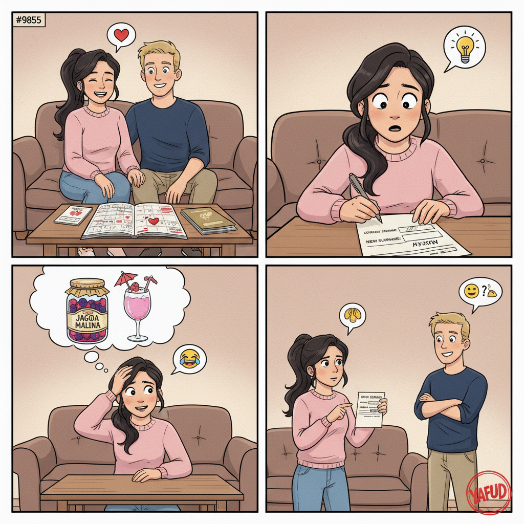 No i co, ja mam na nazwisko Jogurt a moja córcia będzie się nazywać na pierwsze Jagoda a na drugie Malina, więc będzie Jagoda Malina Jogurt, jaki w tym yafud?