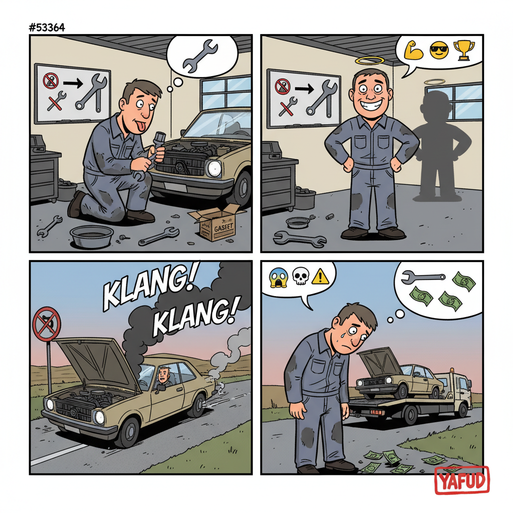 W ramach oszczędności postanowiłem sam wymienić uszczelkę pod głowicą w moim starym samochodzie. Operacja się udała, silnik odpalił, byłem z siebie dumny. Pojechałem na próbną przejażdżkę. Po kilku kilometrach silnik zaczął dziwnie stukać i zgasł. Okazało się, że podczas składania silnika do miski olejowej wpadła mi mała nasadka od klucza. Silnik do remontu, a ja zostałem z lawetą na poboczu. YAFUD«Poprzednia wpadkaNastępna wpadka »